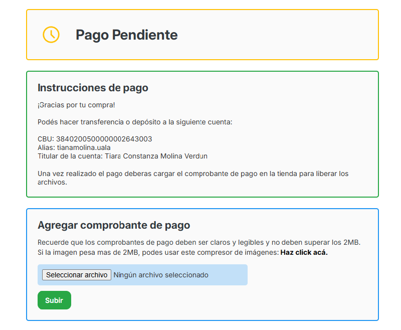 - Si elegiste la opcion de Transferencia Bancaria podras hacer la transferencia con los datos que te dejamos al finalizar el pedido. IMPORTANTE: Una vez realices el pago deberas cargar el comprobante. Te aparecera un boton de "Subir Archivo" abajo de los datos de pago. Una vez subido lo verificaremos y liberaremos los archivos.